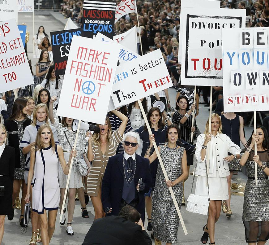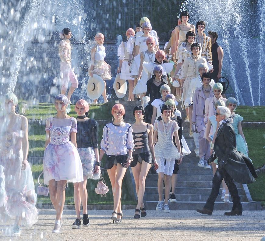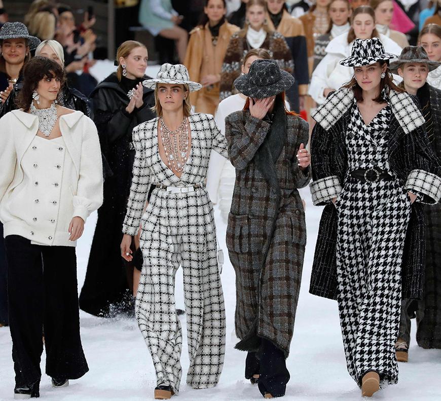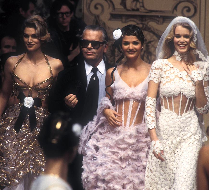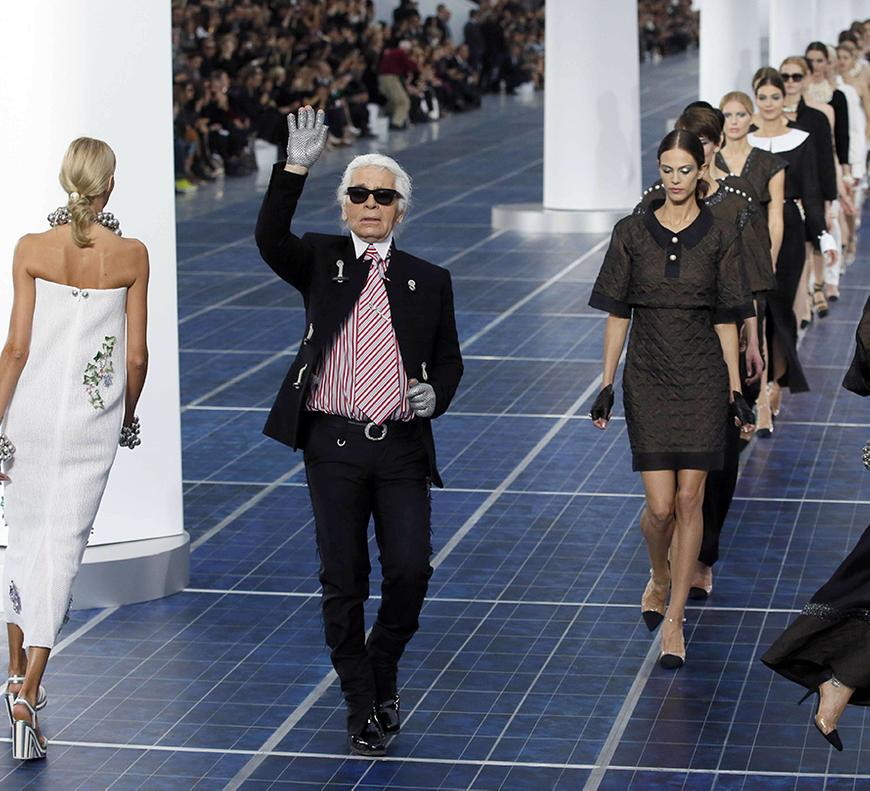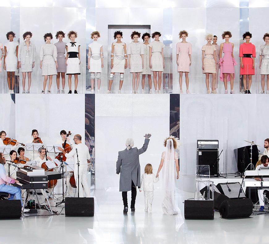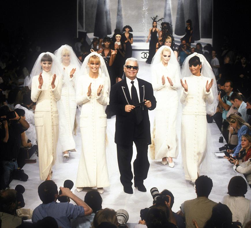 Карл выделил цветовые коды Chanel и фактуру (твид), ключевые предметы — крупный жемчуг, двухцветные лодочки, твидовые костюмы, маленькое чёрное платье. Но что не менее важно — Карл буквально заново придумал бренд, переосмыслив его составляющие. Твид перестал быть скучным, буржуазная одежда для зрелых дам превратилась в мечту молодых девушек.