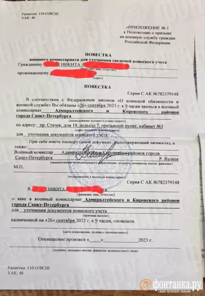 Собеседник издания рассказал, что получил обычную повестку с приглашением прийти в военкомат для уточнения документов воинского учёта. «Фонтанка» опубликовала фото этого документа.