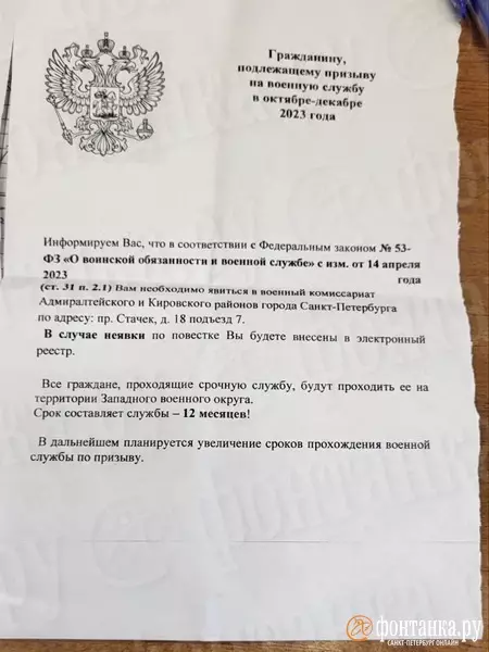«Фонтанка»: петербуржца предупредили о возможном продлении военной службы. Мужчина призывного возраста по имени Никита прислал в издание фото, предположительно, повестки из военкомата. В документе говорится, что срок военной службы составляет 12 месяцев, а также указано, что «планируется увеличение сроков прохождения военной службы по призыву». В случае неявки призывников грозят вносить в электронный реестр.