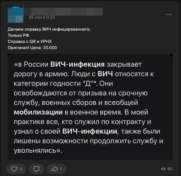 Проснулись и разного рода «справочные» аферисты. Так, в Даркнете и тематических Telegram-каналах стали активно появляться предложения оформить поддельные медсправки о ВИЧ-инфекции и других тяжёлых заболеваниях, гарантирующих отсрочку от службы. За вознаграждение, разумеется.
