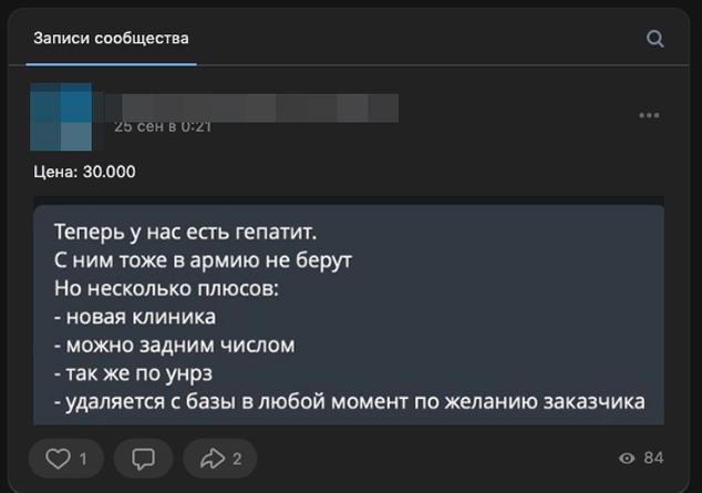 Например, в одной из тематических групп сразу находится ворох предложений. Так, сделать фейковую справку о наличии ВИЧ можно за 20 000 рублей, а вот задокументировать у себя гепатит почему-то дороже — 30 000 рублей.