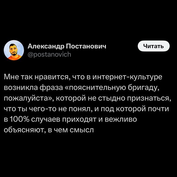 Но сейчас «пояснительную бригаду» вызывают даже для несложных случаев. И это само по себе превратилось в часть этого мема — как будто для того, чтобы что-то объяснить, нужен целый отряд интернет-экспертов.