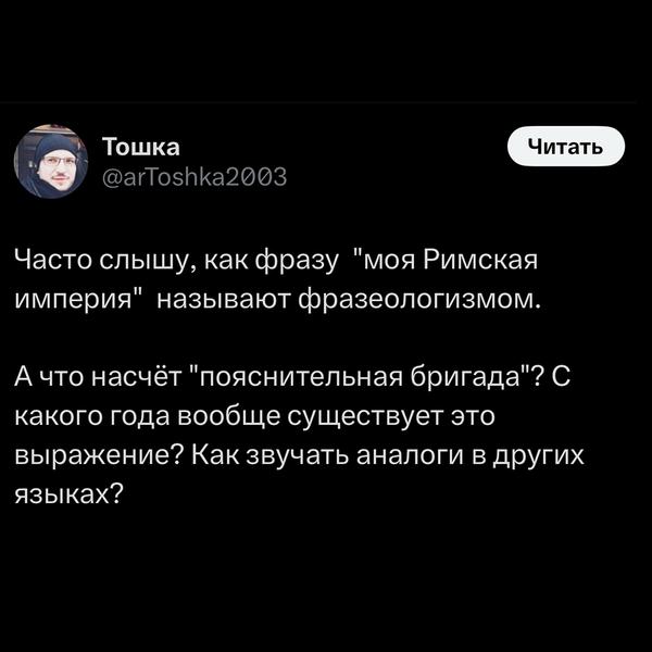 Оригинально «пояснительная бригада» была нужна для сложных случаев, когда смысл поста или мема непонятен без контекста. Например, если автор отсылает к каким-то старым медиаявлениям, которые молодые пользователи интернета уже не застали.