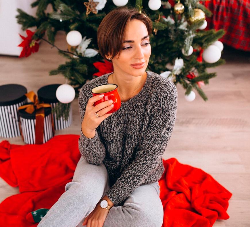 Я часто рекомендую использовать в таких новогодних съемках чашку с горячим какао или чаем. Тёплая чашка в руке поможет вам расслабиться и лучше передать настроение какого-то уюта. Также можно использовать, например, мандарины, все те символы, которые у вас самих вызывают ощущение праздника. Лучше, если вы сфокусируетесь на этом ощущении и забудете, что вам нужно «позировать».