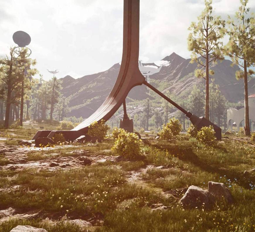 Игрок смотрит на виртуальный пиксельный рай рабочего класса. Мерцают монорельсы и подвесные мосты, а дроны жужжат как труженики-пчёлы. Сквозь облака вырисовывается статуя: огромная воинственная женщина с высоко поднятым мечом в одной руке и гигантским левитирующим шаром в другой. Этот монумент, по игровой легенде, носит название «Зов Родины» и был установлен в 1949 году как ознаменование победы Советского Союза во Второй мировой войне. Прототипом статуи стала существующая «Родина-мать зовёт!» из Волгограда.