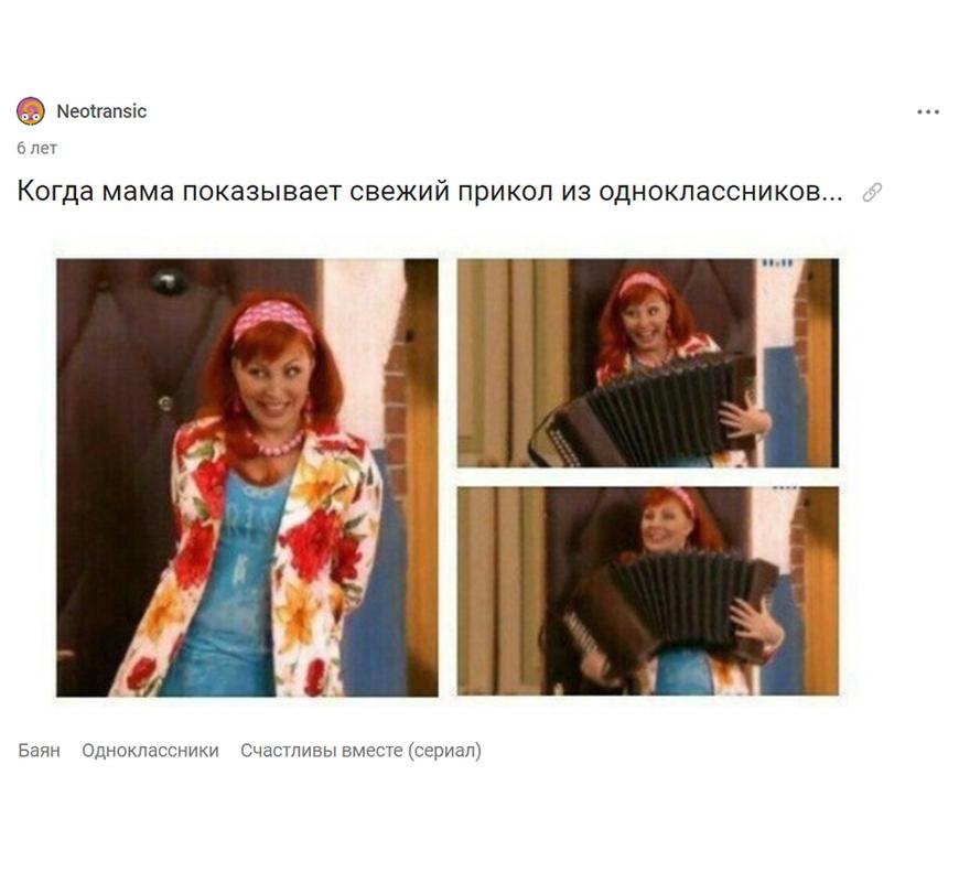 Например, в «Одноклассниках» высоко котируются семейные ценности. Помимо бесконечных снимков детей и внуков, обитатели соцсети постят уютные семейные вечера в гостиной с оливьешкой на столе и ковром на стене, что вызывает усмешки у молодого поколения.