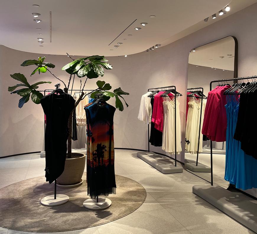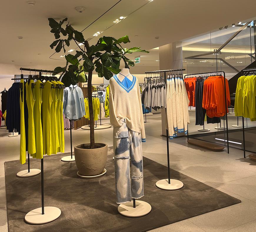 С улицы встречают минималистичные витрины со световыми инсталляциями. Внутри — просторно: видимо, визуальным мерчендайзерам пришлось потрудиться, чтобы заполнить большую площадь магазина. То и к лучшему: никаких нагромождений мебели и рейлов, зато нашлось место для зелёных растений и ваз с полевыми цветами.