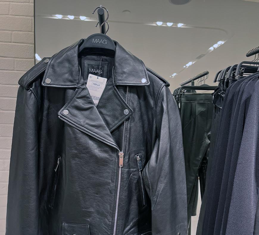 - Брутальная куртка-косуха стоит 15999 рублей, на бирке — 100% бычья кожа, хотя консультанты утверждают, что это — искусственный материал. Любопытное расхождение в показаниях.