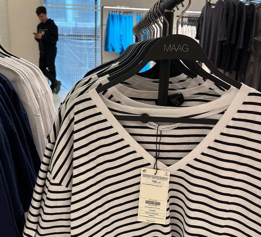MAAG от предшественника не отступает, но, видимо, делает больший упор на собственное прочтение. В магазине представлена одежда для женщин, мужчин и детей. В ассортименте — и база, и горячие тренды сезона. Аксессуарная группа и обувь отсутствуют — образы манекенов дополняют базовые белые кеды no-name. Прошерстили бирки, оказалось что география производства «дружественная»: Бангладеш, Пакистан, Марокко, Турция, Китай.
