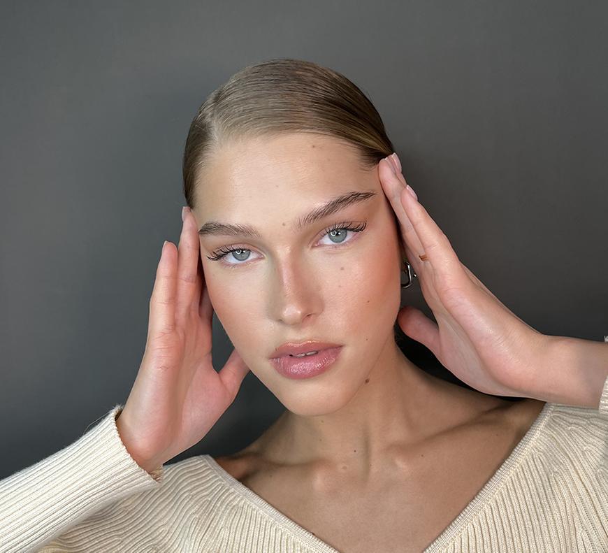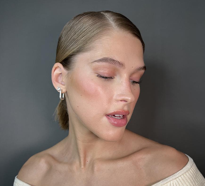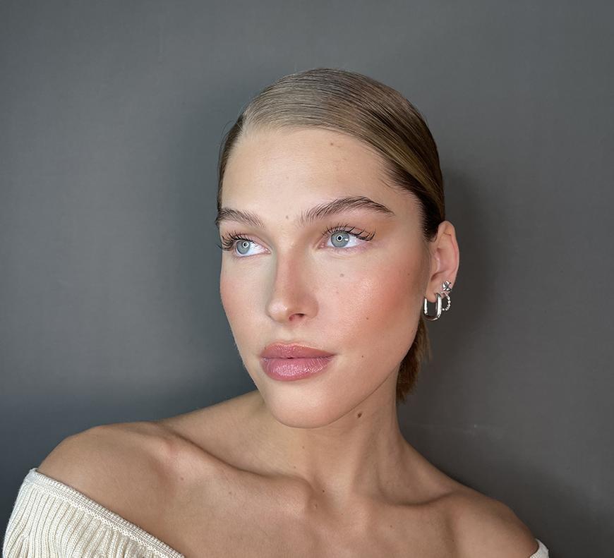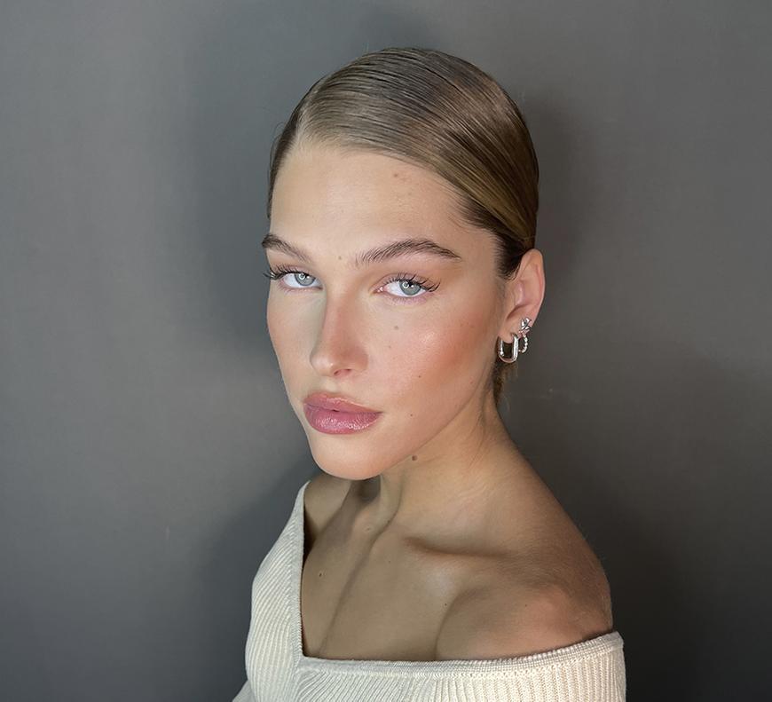 Особенность макияжа Хейли в порядке нанесения продуктов. После очищения и увлажнения кожи нужно сразу приступить к кремовому контурингу и бронзированию лица.